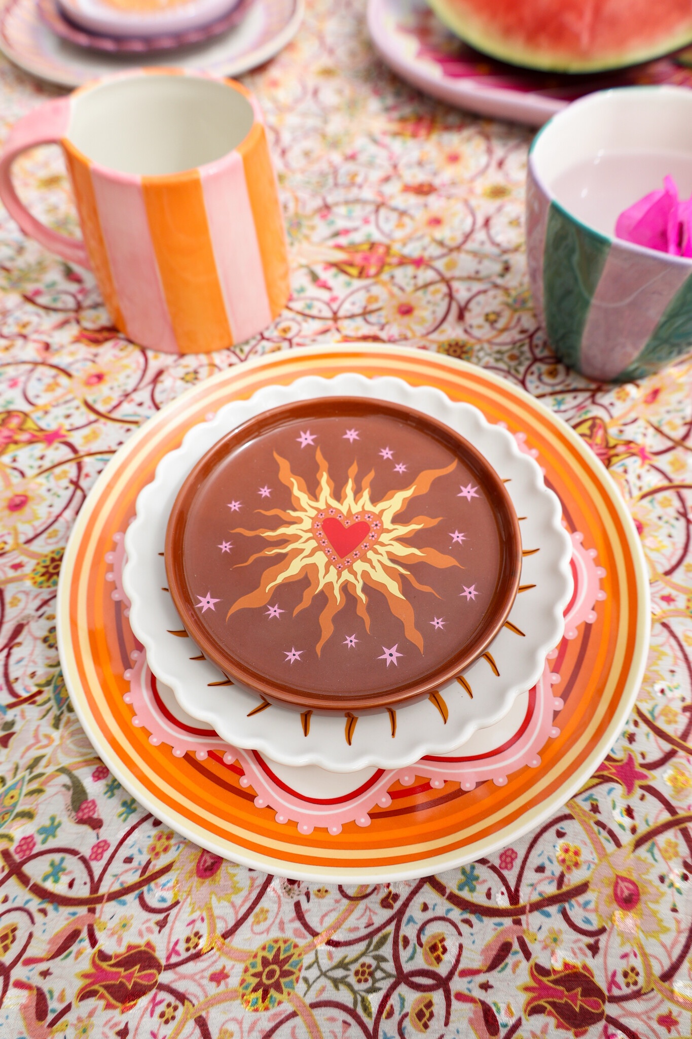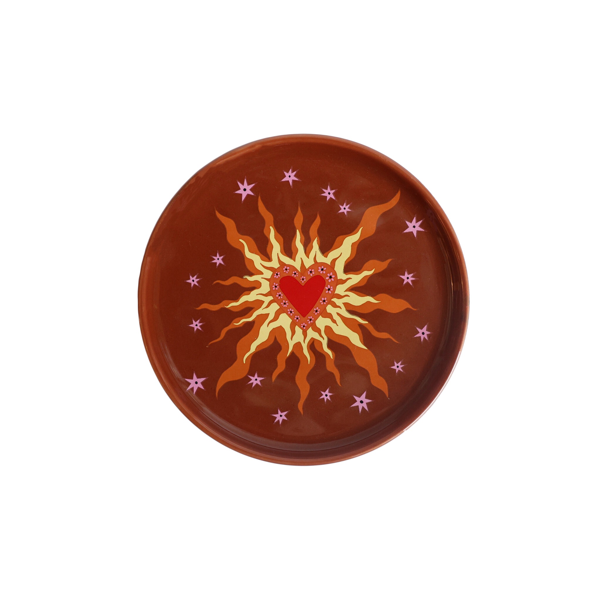 Son motif central en forme de cœur, entouré de rayons solaires aux teintes chaudes, évoque l’énergie positive, la chaleur et la protection. Le tout est ponctué de petites étoiles lilas sur un fond brun profond, créant un contraste fort et un univers visuel à la fois bohème et poétique.