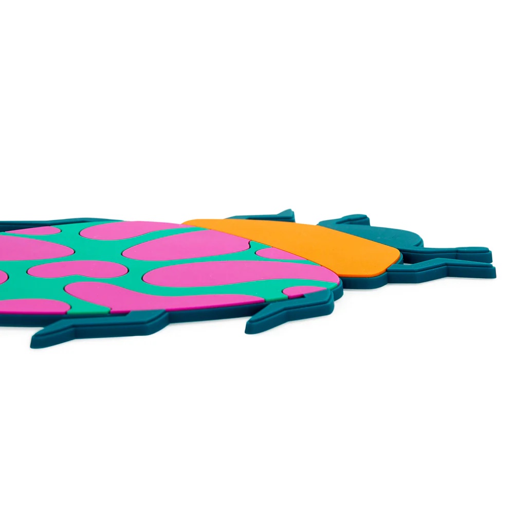 Ajoutez une touche de fantaisie et de design à votre cuisine avec ce dessous de plat original en caoutchouc, aussi pratique que décoratif. En forme de coléoptère stylisé, il séduit par son graphisme audacieux, ses couleurs vibrantes (rose, vert, orange et bleu profond) et son allure résolument contemporaine.